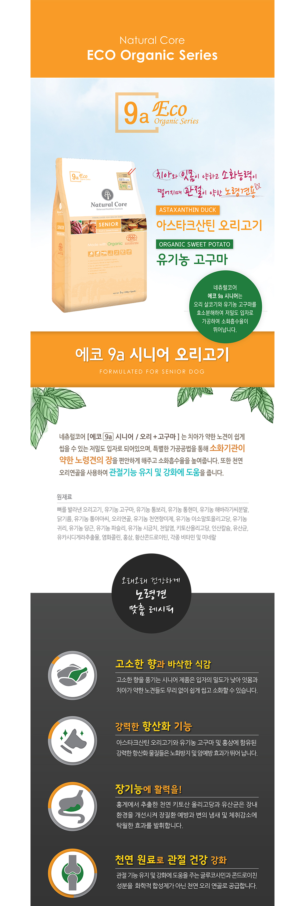 네츄럴코어 70% 유기농 에코 9A 시니어 오리&고구마2.4kg 이미지 확대 보기